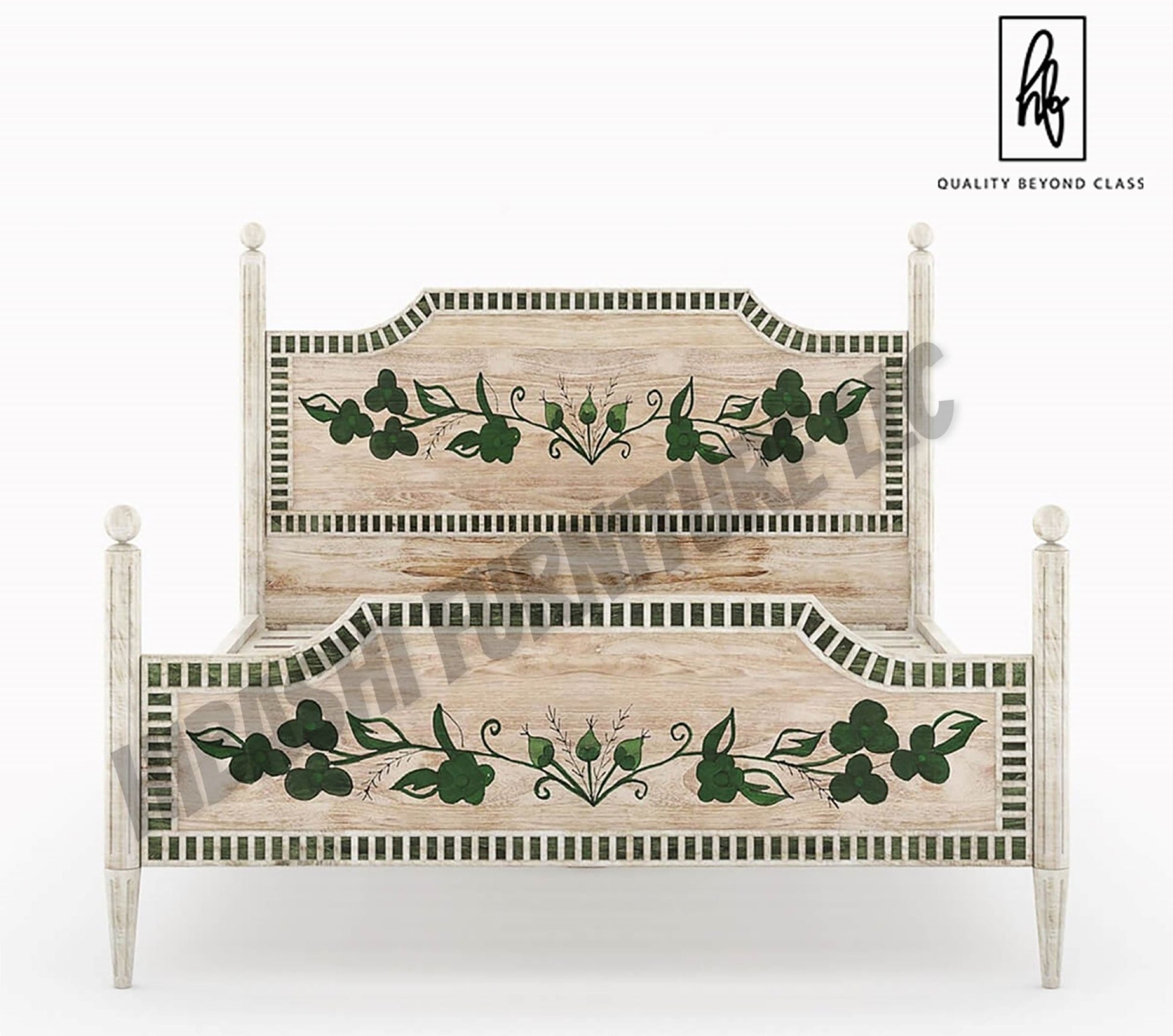 A perfect blend of nature and art, this gorgeous piece comes with an identical design of headboard and footboard that lends it an interesting silhouette. The headboard and the footboard feature a wonderful work of hand-painted design with floral motifs in a green tone in addition to the borders that are also hand-painted in green. This is in complete contrast with the white weathered finish that runs across its frame, creating an attractive appeal. The beautiful grains and texture of the solid wood are hard to miss, but what charms the most is its elegantly designed frame.