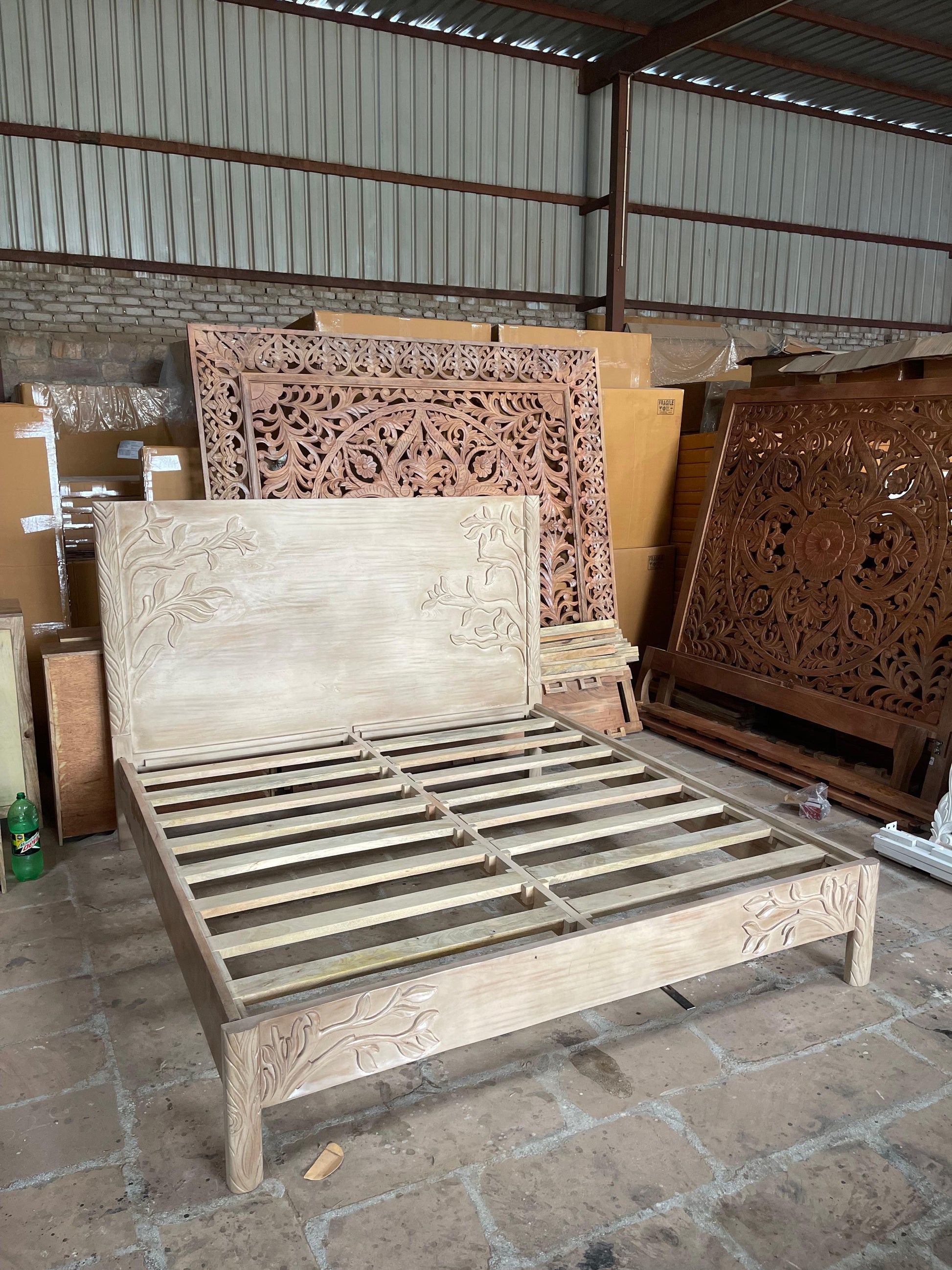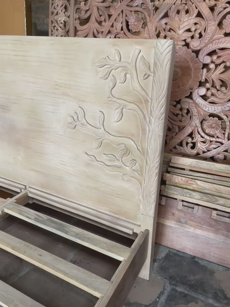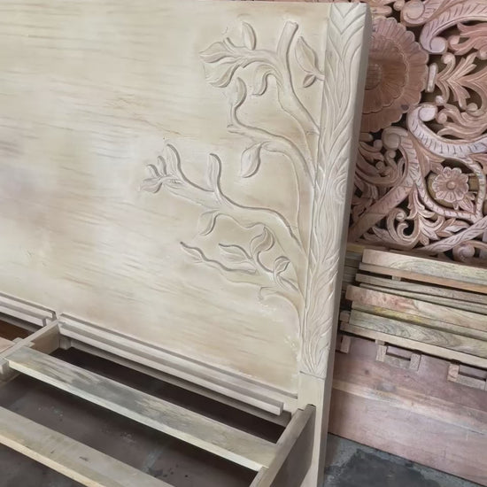 This exquisite hand-carved bed depicts a serene scene on a treetop. Retro style clothing had an influence on it. It is the perfect statement piece, or set, for a creative retreat with a forest theme. Fans of the Ornithology series are raving about the exquisite craftsmanship and timeless heirloom qualities of this series.