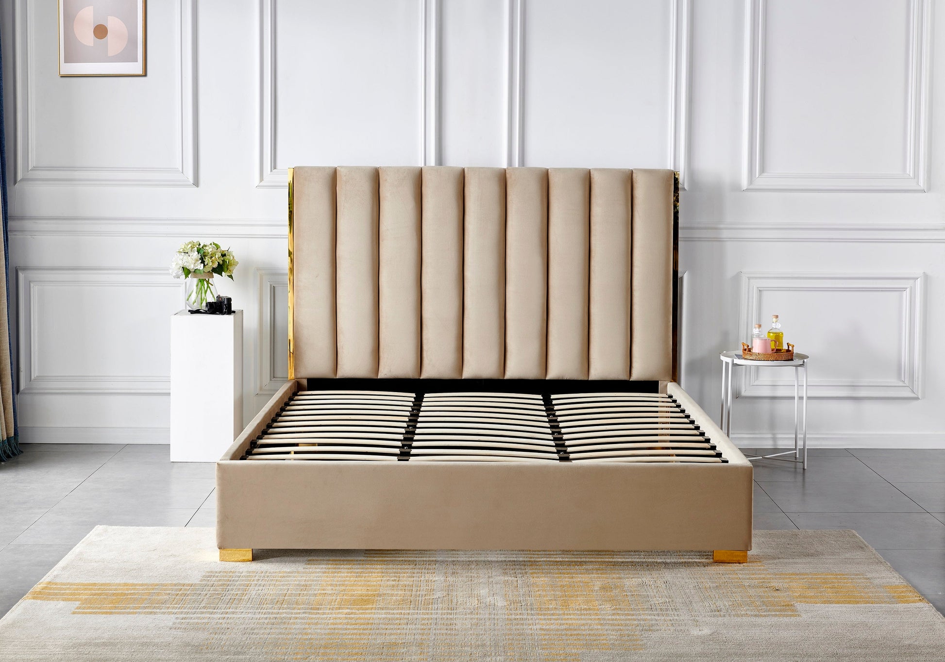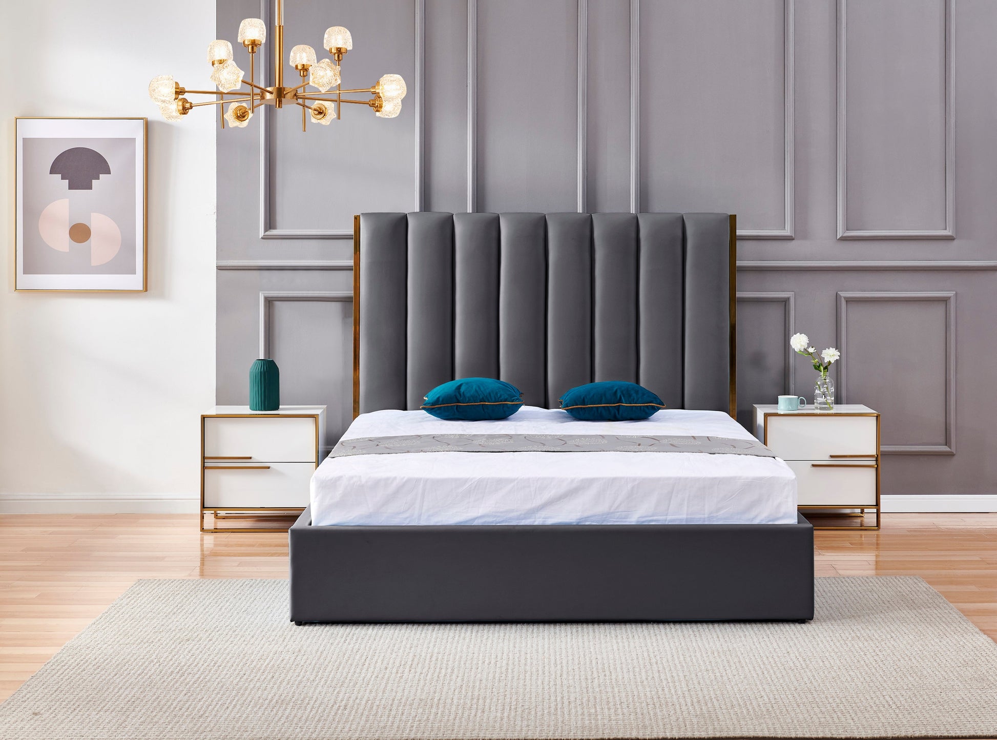 - Charactertics: it's deep panelled headboard, also with gold metal decro on the headboard, fashion and modern.