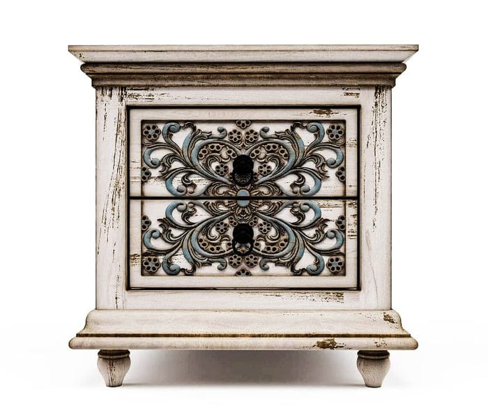 The main body of the headboard is comprised of stunning hand-carved detailing and a geometric-carved base that adds levity to the heavy design.
