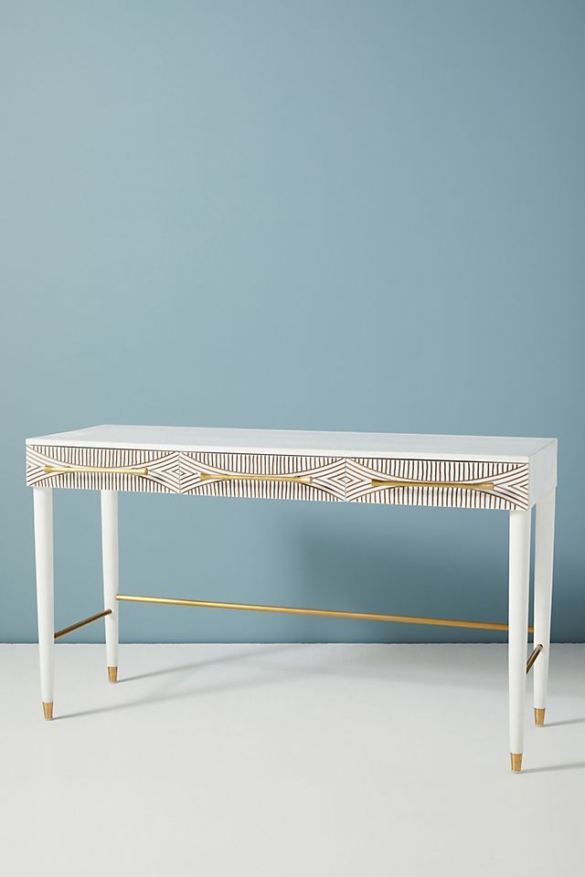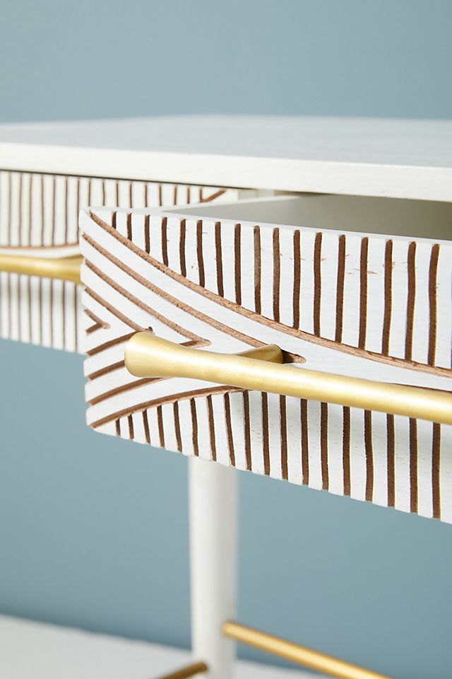 The contrasting, hand-carved design on this globally inspired piece creates an optical delight worthy of a double-take. Finished with brass-capped legs and rough-hewn brass pulls, it provides a well-balanced juxtaposition to a modern home office.