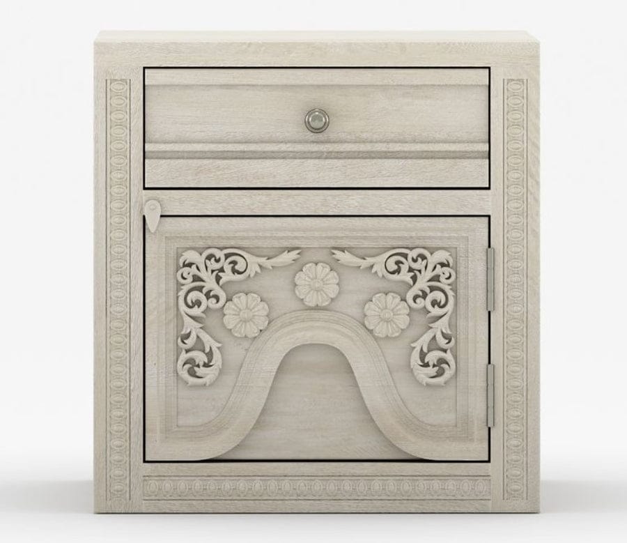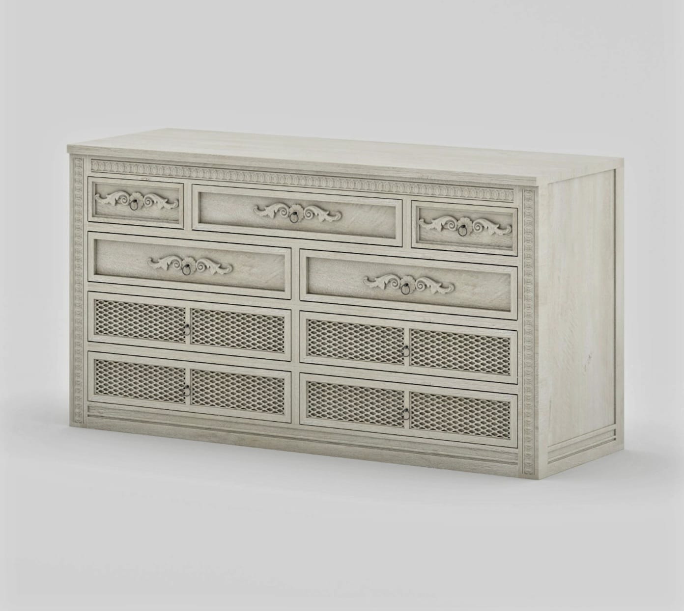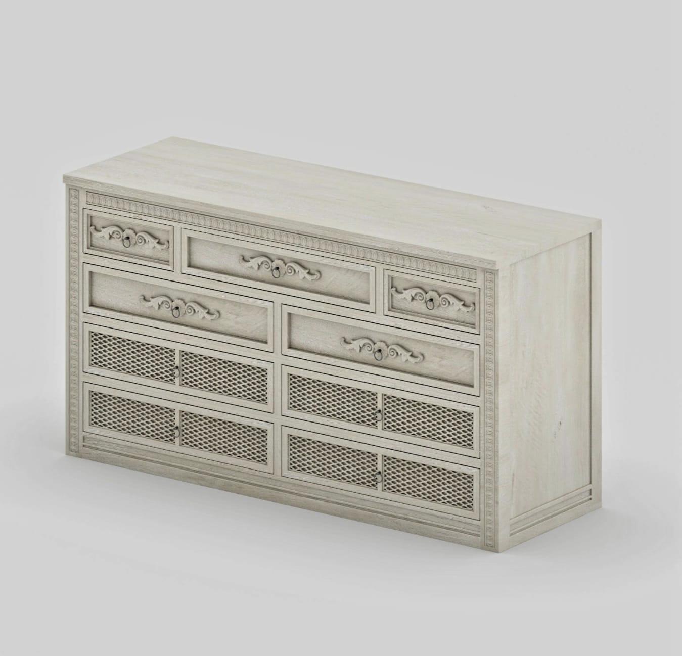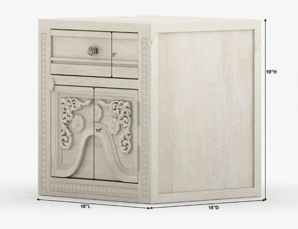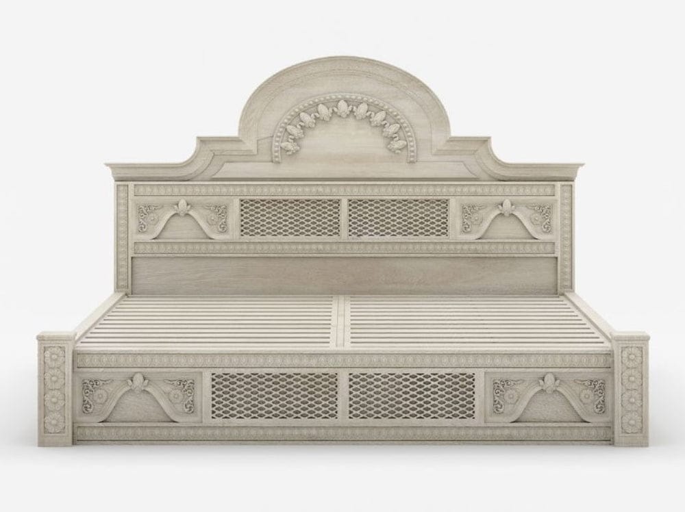 The main body of the headboard is comprised of stunning hand-carved detailing and a geometric-carved base that adds levity to the heavy design.